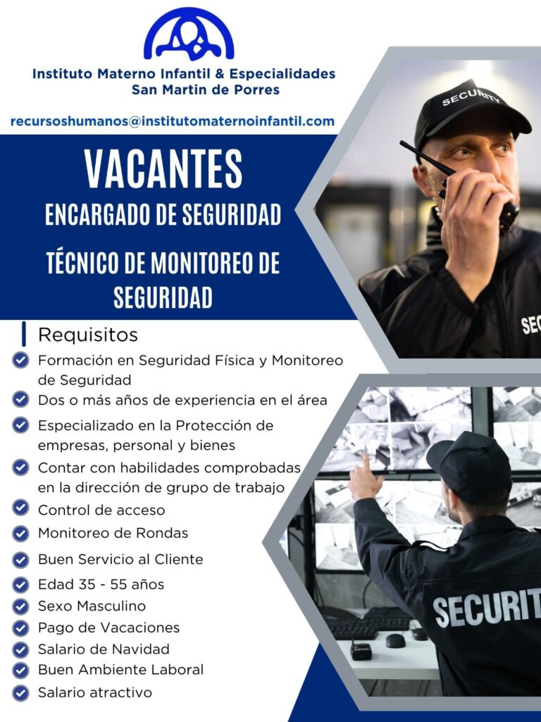 VACANTES PARA ENCARGADO DE SEGURIDAD Y TÉCNICO DE MONITOREO DE SEGURIDAD